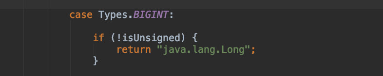 在ResultSetMetaData.getClassNameForJavaType()的方法中可以看到Mysql字段对应的Java字段,我们可以得知在Mysql中查询的count得到的数据库类型是BigInt类型的对应的Java类型是Long