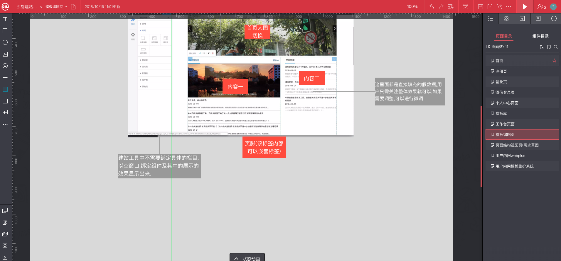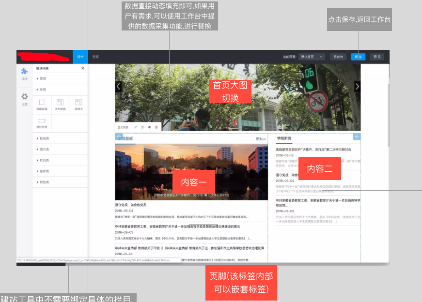 通过托拉拽方式快速生成页面模板,进行预览及发布.