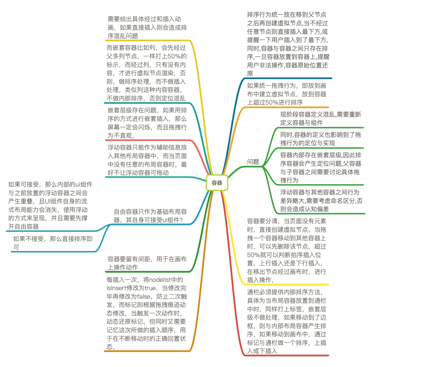 比较麻烦的处理在于限制拖拽即时排序方法,当有嵌套层级时,过于灵活的直接插入在用于深层级嵌套时反而让使用者无所适从,比如想要做一个第二层级排序操作,但由于使用了即时排序,如果还有内嵌层级,当移动进入时会进行插入操作.当然这一点本身也是因为思虑不周,认为只要鼠标经过容器之上,既然无法判断用户是否需要插入嵌套层级,那么直接做插入处理,但真实对接业务场景却发现有些容器内部因为自身内容过长,导致容易误操作,之后约束了hover事件,采用drop事件用于判断真实嵌套意图或排序.