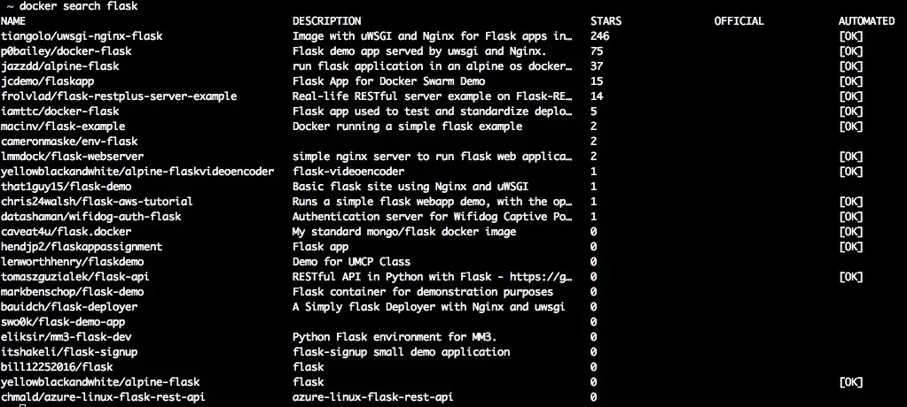 大概了解了Docker的概念以后,我们就尝试拉取flask镜像使用一下。 查找镜像可以通过hub.docker.com/网站来搜索,或者通过命令搜索。