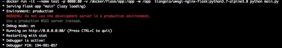 docker run -it --name test -p 8080:80 -v /docker/flask/app:/app -w /app tiangolo/uwsgi-nginx-flask:python3.7-alpine3.8 python main.py