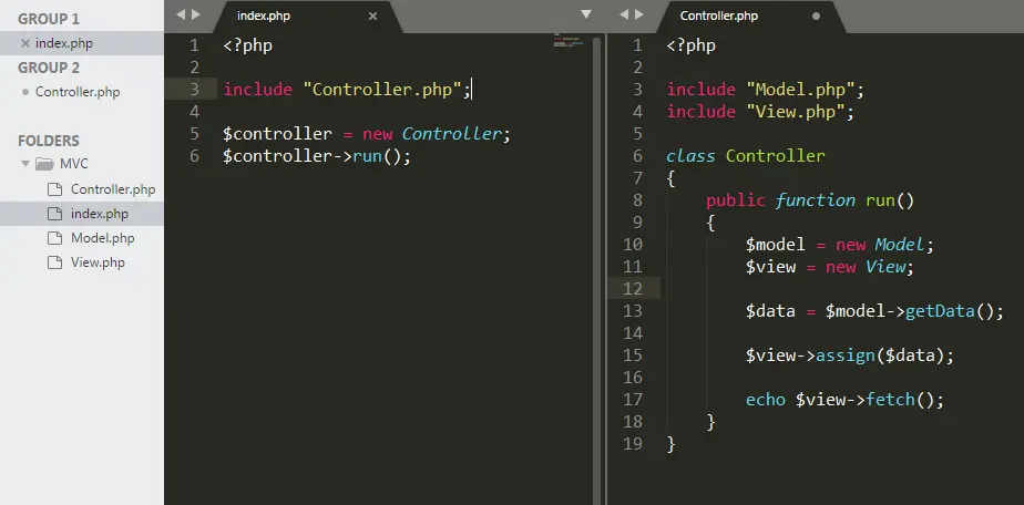 分别建立Controller类 Model类 View类,并独立到三个文件中,请求由index.php处理
