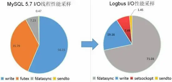 如上图所示,经过优化:左图35.79%的锁竞争(futex)已经被完全消除;同压测压力下,56.15%的文件I/O开销被优化到19.16%,Slave I/O线程被优化为预期的I/O密集型线程。