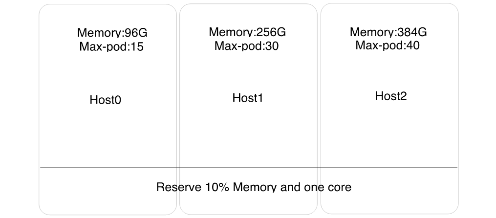 介绍完一般的调度策略后,接着说上文提到的杜绝OOM的策略。首先,调度之前,对于不同配置的宿主机限定不通的Pod数量,此外设定10%的占位策略,如下图所示,并且设定Pod的request == maxmemory。