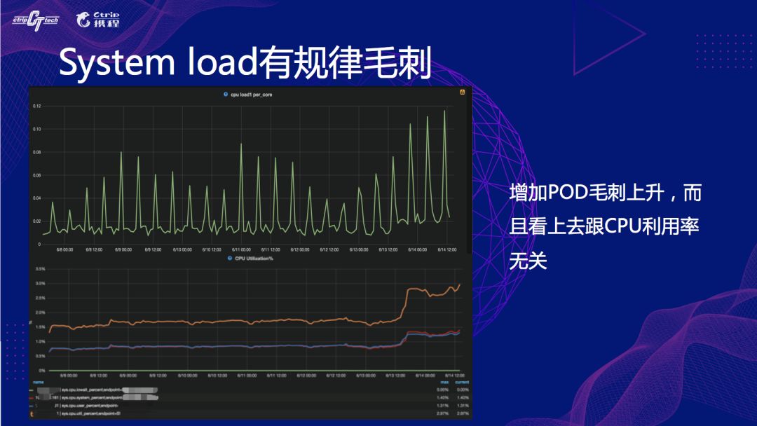 首先是System Load有规模毛刺,每7小时一次,我们可以看到监控上,增加Pod后毛刺上升,但看上去跟CPU利用率没什么关系。