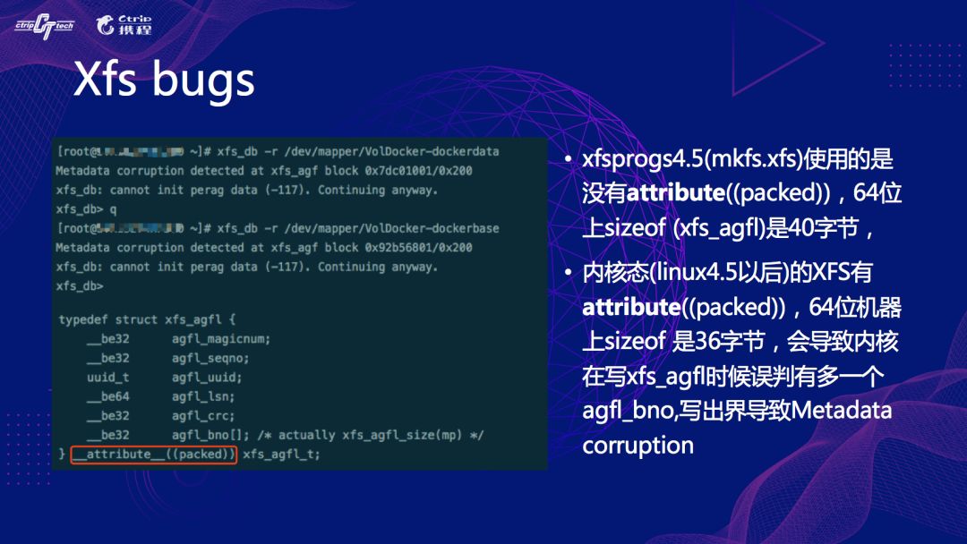 还有一个是Xfs的bugs,Xfs我们发现的有两个比较严重的问题,第一个是字节对齐的问题,这个比较隐蔽,简答地说就是内核态的Xfs header跟用户态的Xfs header里面定义不同,导致内核在写Xfs的时候会越界。下图中就是很明显的症状,我们升级4.14的内核对内存对齐打了patch解决了该问题。