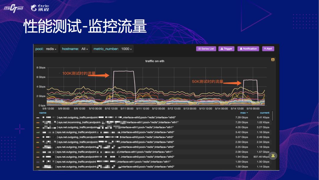 这第三张图就更明显了,这是我们测试对比生产实际物理机的流量对比,我们测试的流量远高于生产实际运行的单台物理机的流量。