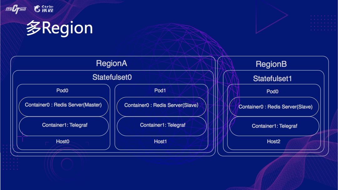 单个Region如下图,一个Statefulset两个Pod分别是Master/Slave,每个Pod里面有两个容器,一个是Redis本身,一个是监控程序telegraf,部署在两个Host上。