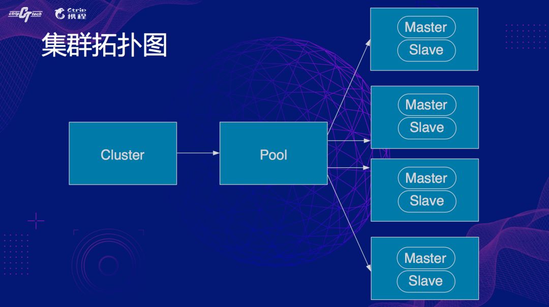 这个图里面我们可以看到集群,Pool,Group还有里面的实例,这是携程Redis一个比较常见的拓扑图,如下图: