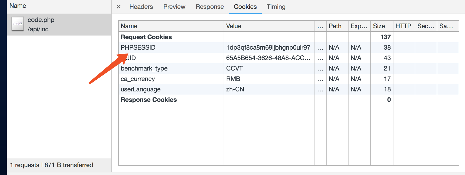 生成的PHPSession Cookie: