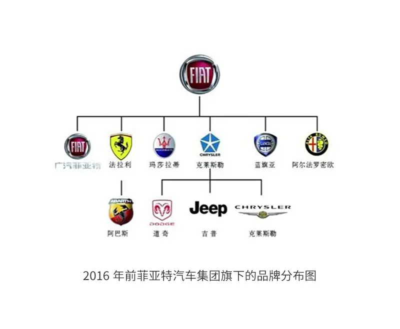 聊到意大利汽车大家自然是希望了解一下比较熟悉的法拉利跟玛莎拉蒂,其实这两个品牌非常有渊源,比方同一个父亲,都属于菲亚特集团的旗下品牌,菲亚特这个意大利汽车制造集团在国内知名度其实很低,因为它在国内只有一个合资品牌叫广汽菲亚特,制造的车款极少,而且卖得很惨淡,但其实它的体量完全可以跟日本的丰田集团及德国的大众集团旗鼓相当,不相信的可以看看它2016年前旗下的品牌分布图: