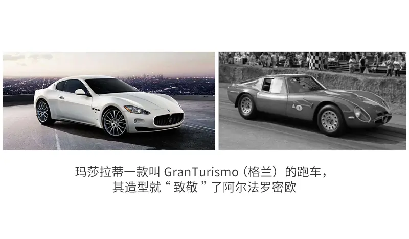 而且在50年代F1赛车造型的创立者——法拉利、玛莎拉蒂等诸多品牌都借鉴了阿尔法罗密欧成功的造型和设计,当然用现在的话来说,叫致敬,比方我们看看玛莎拉蒂一款叫GranTurismo (格兰)的跑车,其造型就确实“致敬”了阿尔法罗密欧。