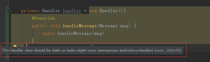 我们经常使用handler时,会像如上那样定义,但是AS的lint检测会自动报错警告提示,如下图