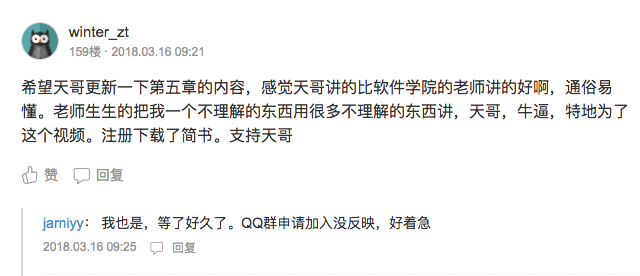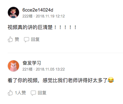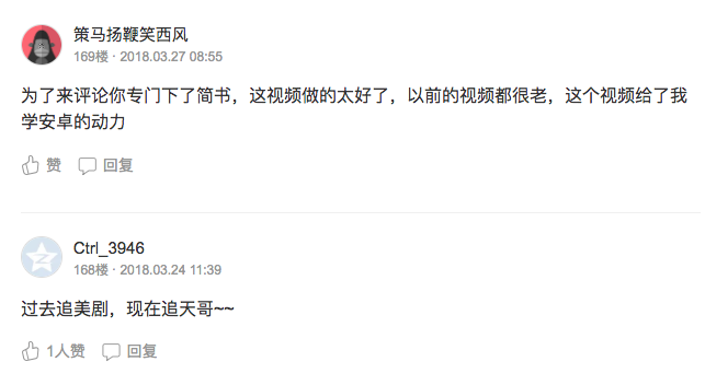 第二个星期的周末,第一集视频录制完成,这是一个很特别的时间节点,像里程碑一样。但是我并不知道把这集视频放到哪个平台给别人观看,我看了腾讯视频、优酷网等各个网络平台,好像都挺麻烦的。最后我选择了一个奇怪的方式,把视频上传到了我的百度云盘,然后在简书上开了一篇文章,贴上云盘的链接,每录制一集就更新一下,就这样,录制了39集。这期间不断收到好评: