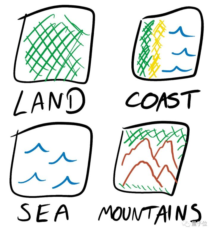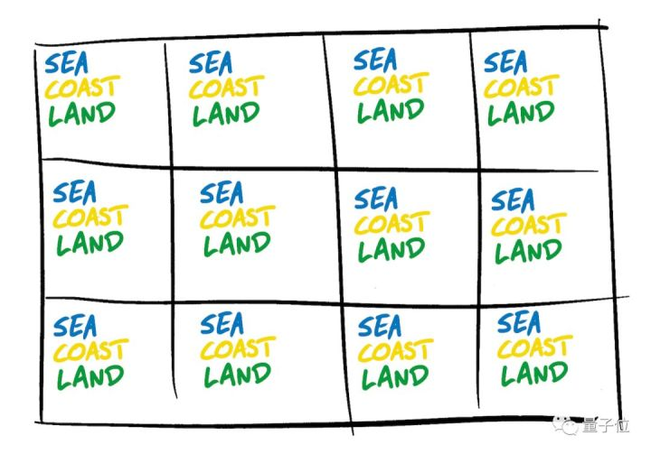 在这个模型中,可以将每种元素用像素形式呈现,并赋予一种单独的颜色。举个例子,下图陆地、海岸、海洋和山川四种地形图块都用了不同的颜色来表示。