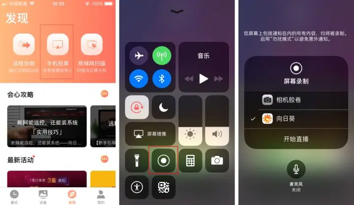 投屏手机不需要额外硬件,也无需复杂操作,App 内选择「手机投屏」后,只需将控制中心的「屏幕录制」功能改为「向日葵」并选择「开始直播」即可完成准备工作。Android 用户使用也同样简单,只需按照 App 提示操作即可。