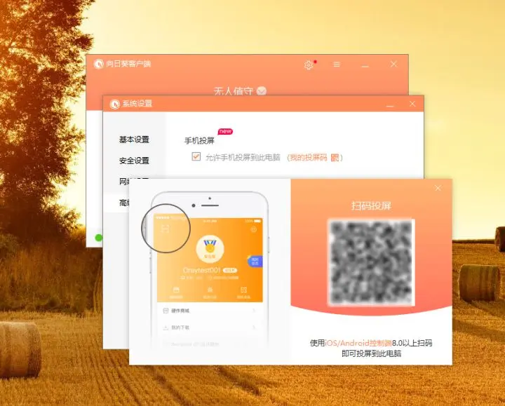 App 内提供了多种投屏方式供你选择,「扫码投屏」非常适合在产品设计相关的中大型会议中进行展示,在连接会议室投影的电脑安装向日葵客户端之后,在手机上打开投屏码(系统设置 - 高级设置 - 手机投屏),扫码就可以将手机屏幕投到会议室的大屏幕中了。