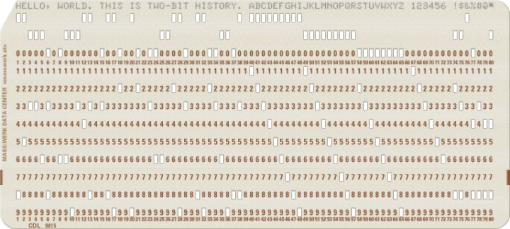 这一黄金时期也是 打孔卡(punch card)编程时期。在 20 世纪 60 年代,IBM 打孔卡设立了标准,这个标准就是打孔卡的宽度为 80 列。这个 80 列标准在后来的电传打字机和哑终端时期得以延续,并逐渐成为操作系统中隐藏的细节。时至今日,即使我们用上了更大、更好的屏幕,偏向于使用更长的标识符而不是类似 iswcntrl() 这样令人难以猜测的函数名,可当你打开新的终端模拟器窗口时,默认的宽度依然是 80 个字符。