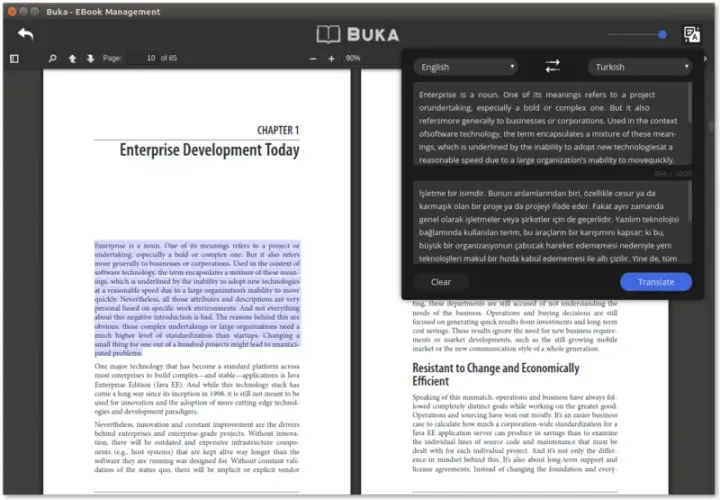 你可以创建单独的 PDF 文件列表并轻松地在它们之间切换。Buka 也提供了一个内置翻译工具,但是你需要有效的互联网连接来使用这个特性。