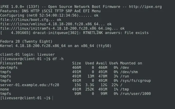 $ echo 'kernel.printk = 0 4 1 7' > /fc28/etc/sysctl.d/00-printk.conf定义网络引导镜像中的本地 liveuser 用户: