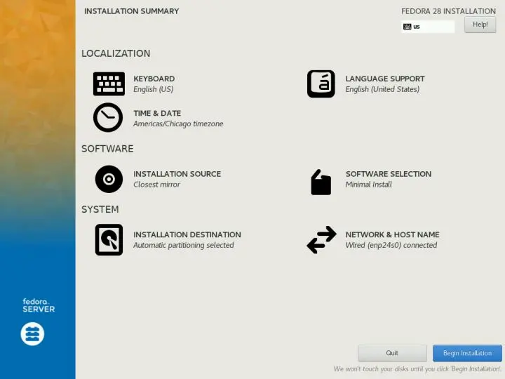 首先去下载 Fedora 服务器的 netinst 镜像,将它刻录到一张光盘上,然后用它引导服务器来重新格式化。我们只需要一个典型的 Fedora Server 的“最小化安装”来作为我们的开端,安装完成后,我们可以使用命令行去添加我们需要的任何额外的包。