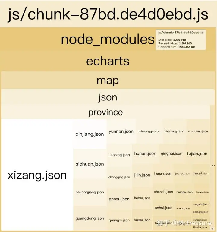 ECharts 的 JSON 地图文件占了很大一部分,大概有 1.96MB,gzip 以后 900KB,这一部分没有办法做处理。ECharts 组件本身可以使用按需加载