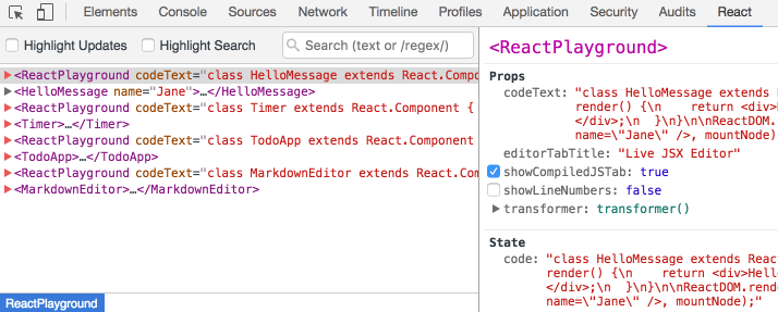 这个官方的 React Chrome devTools 扩展程序可以让你在 Chrome 开发者工具里查看 React 组件的层次结构。它也可以作为 FireFox 附加组件使用。