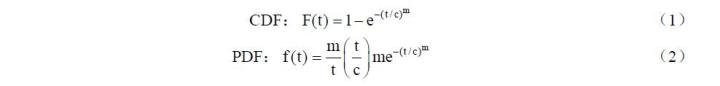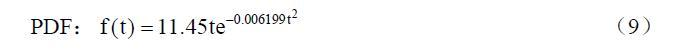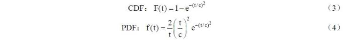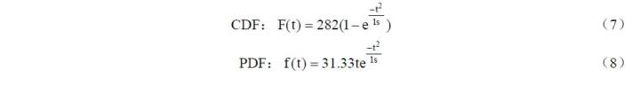 c 参数为常量c= √2tm,tm是 f(t)达到峰值时对应的时间。在实际应用过程中,会在公式前面乘一个系数K(K 为所有的缺陷数),将K 值代入公式(3)和公式(4)中,累积分布函数(CDF)和概率密度函数(PDF)为: