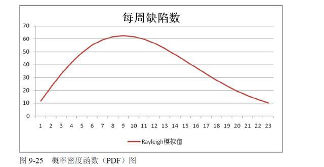 【实例】通过Rayleigh 模型的概率密度来评估测试过程和软件质量。计划升级一个历史项目,以前的历史数据统计表明,该项目千行代码缺陷率为9.56 个,估计升级后该项目的代码行数为102KLOC(千行),希望本次升级发现的千行缺陷数比之前少5.3%,即总缺陷数预计为9.56×102×(1-5.3%)=923.44 个,计划项目的测试时间为22 周。将数据代入到Rayleigh 模型中的概率密度函数中,得到PDF 为: