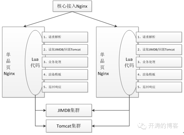 整体处理过程和普通Web应用没什么区别:首先接收请求并进行解析;然后读取JIMDB集群数据、如果没有则回源到Tomcat获取;然后进行业务逻辑处理;渲染模板;将响应内容返回给用户。