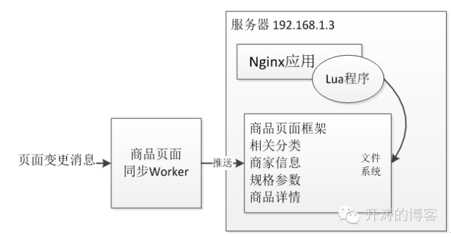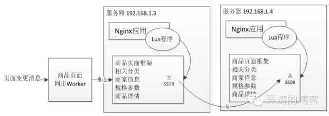 2.3、 第三张图和第二张图的不同处是不再直接读取文件系统,而是读取本机的Redis或者Redis集群或者如SSDB这种持久化存储或者其他存储系统都是可以的,比如直接说的商品页面可以使用SSDB进行存储实现。文件系统一个很大的问题是当多台服务器时需要Worker去写多台服务器,而这个过程可以使用SSDB的主从实现。