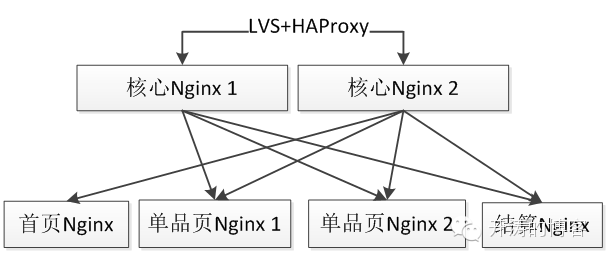 如上图,我们首先通过LVS+HAProxy将流量转发给核心Nginx 1和核心Nginx 2,即实现了流量的负载均衡,此处可以使用如轮训、一致性哈希等调度算法来实现负载的转发;然后核心Nginx会根据请求特征如“Host:item.jd.com”,转发给相应的业务Nginx节点如单品页Nginx 1。此处为什么分两层呢?