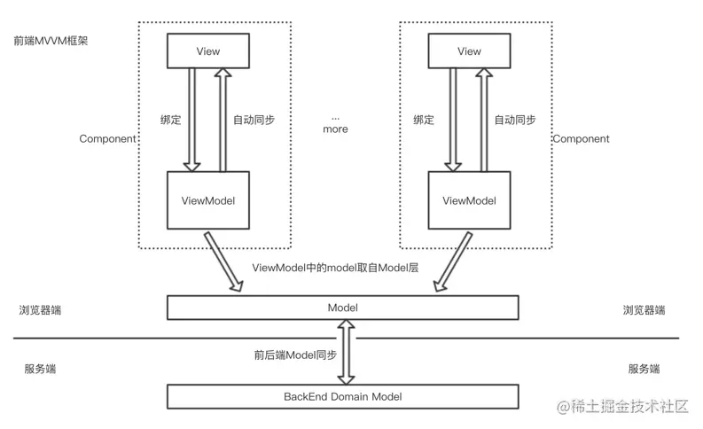 Model 层: 对应数据层的域模型,它主要做域模型的同步。通过 Ajax/fetch 等 API 完成客户端和服务端业务 Model 的同步。在层间关系里,它主要用于抽象出 ViewModel 中视图的 Model。