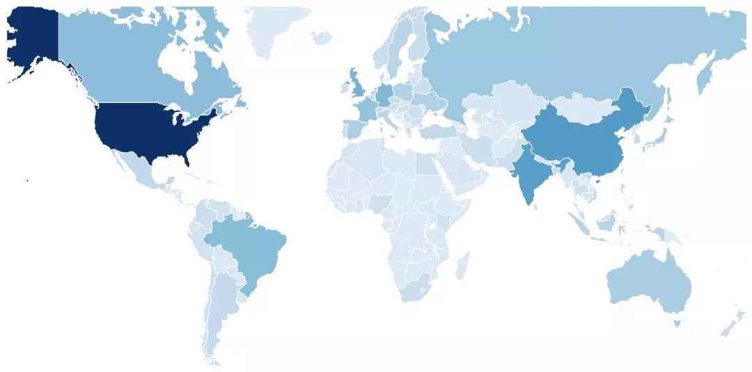 Github 全球用户分布,中国为仅此于美国的第二大用户来源,数据来源: https://www.benfrederickson.com/github-developer-locations/