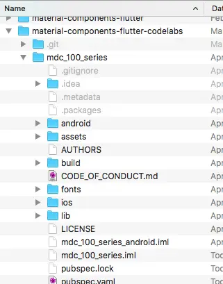 material-components-flutter-codelabs;如果你在终端中下载 .zip 文件,导航到material-components-flutter-codelabs-...然后运行flutter create mdc_100_series。