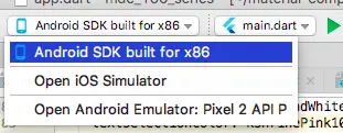 - 在你的编辑器窗口顶部寻找 Flutter Device Selection 下拉菜单,然后选择设备(例如,iPhone SE / Android SDK built for )。