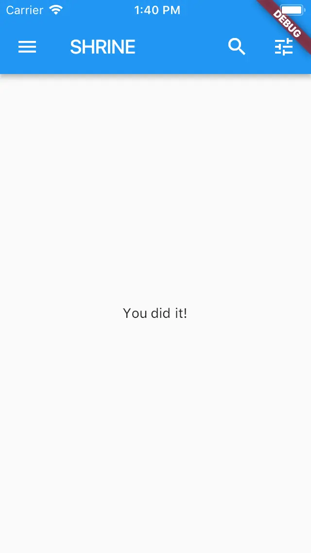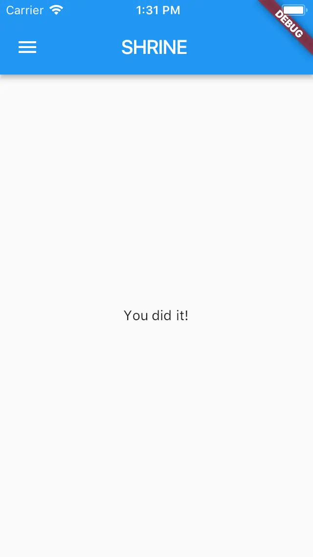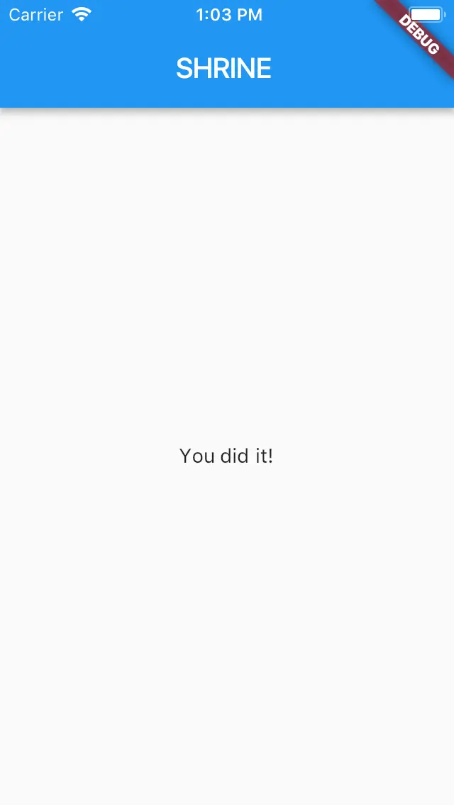 成功!Shrine 的初始登陆代码应该在你的模拟器中运行了。你可以看到 Shrine 的 logo 和它下面的名称 "Shrine"。