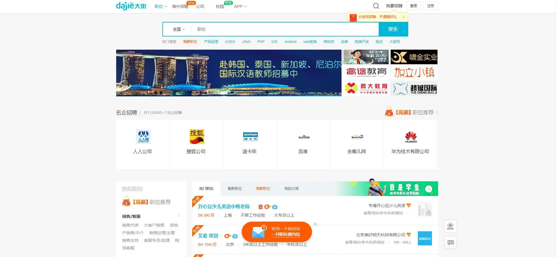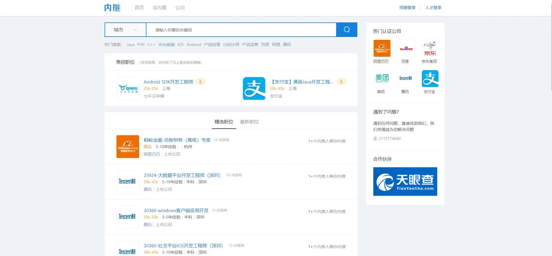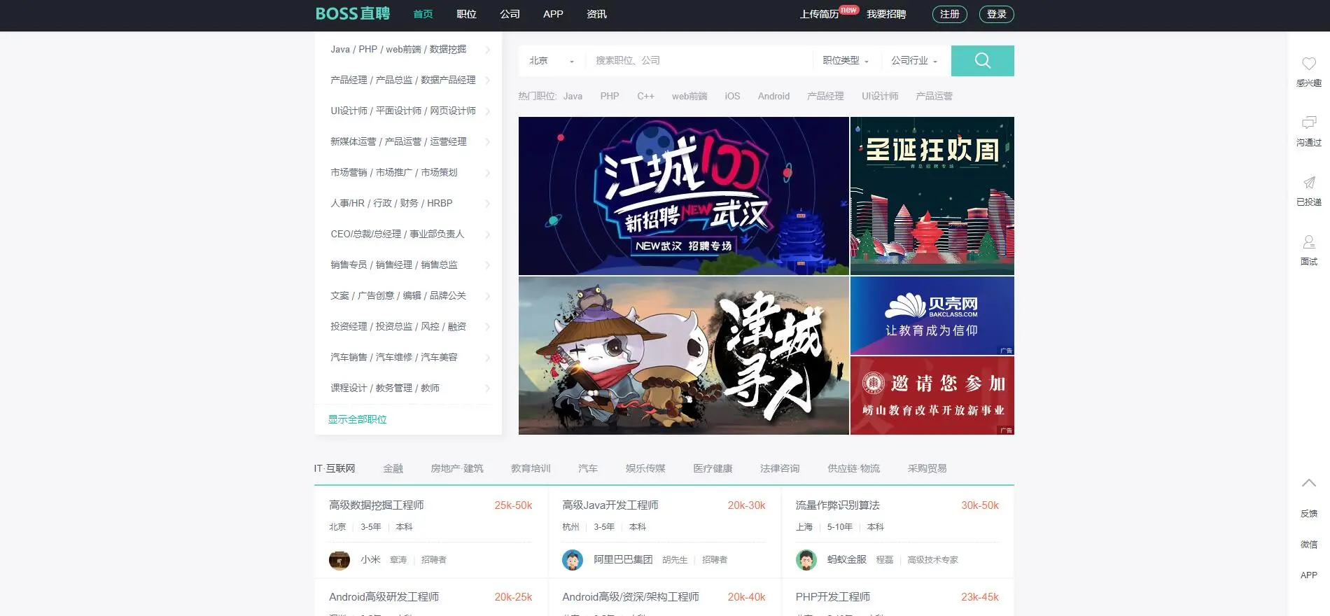 IT招聘网站(程序员跳槽指南) 老_大叔o 2018-12-27 830 阅读1分钟 自从写了上一篇文章程序员接私活平台,发现反响真的是很高啊(๑•̀ㅂ•́)و✧(心中暗喜),这次就写一个IT类招聘的网站吧 原文地址:nolon.xyz/archives/63… 老大叔博客:nolon.xyz 牛客网 地址:www.nowcoder.com 智联招聘 地址:www.zhaopin.com/ 前程无忧 地址:www.51job.com/ 拉勾网 地址:www.lagou.com/ 猎聘网 地址:www.liepin.com/ 中华英才网 地址:www.chinahr.com 大街网 地址:www.dajie.com/ CSDN招聘 地址:job.csdn.net/ 内推网 地址:www.neitui.me/ 100offer 地址:cn.100offer.com/ Boss直聘 地址:www.zhipin.com/