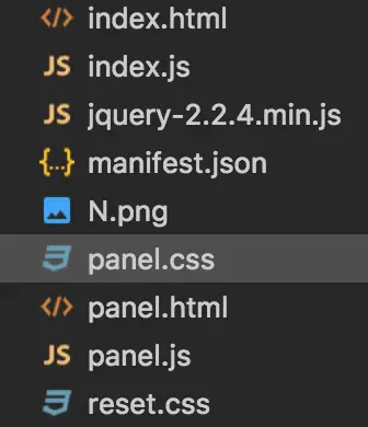 panel.html是index.js中初始化时引入的页面。panel.js和panel.css是它要使用的。