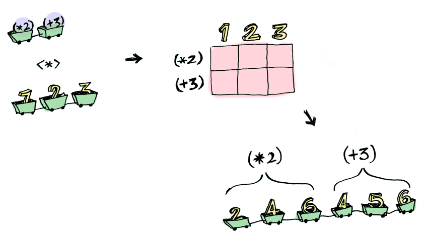 Applicative把Functor推到了一边. “大腕儿用得起任意个参数的函数,” 他说. “用<$>和<*>武装之后, 我可以接受需要任意个未封装的值的函数. 然后我传进一些封装过的值, 再我就得到一个封装的值的输出!”