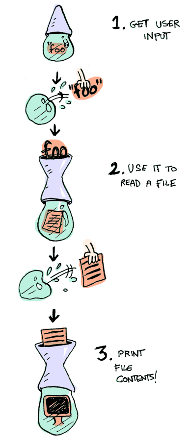 这三个函数都接收一个常规的值 (或者不接收值) 返回一个封装过的值. 我们可以用>>=把一切串联起来!