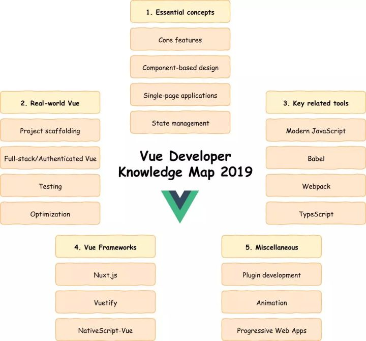 一口气吃不成胖子,试图一下子学习所有东西可能是徒劳的,所以小宅将在本文中展示一个高级“知识地图”,它包含了与 Vue 开发相关的关键领域,你可以使用下图作为 2019 年学习 Vue 的图鉴。