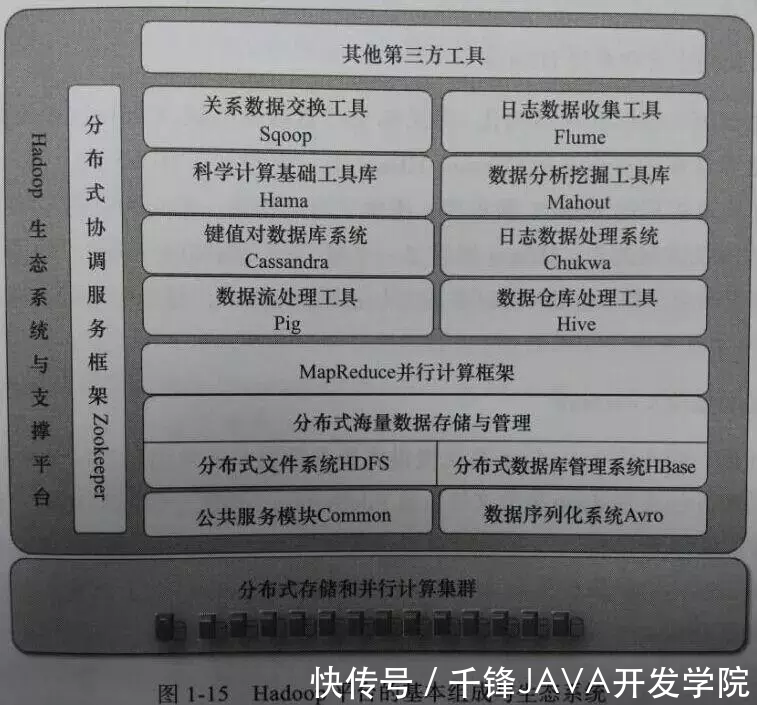 在大数据处理软件系统上,随着Apache Hadoop系统开源化的发展,在最初包含HDFS、MapReduce、HBase等基本子系统的基础上,至今Hadoop平台已经演进为一个包含很多相关子系统的完整的大数据处理生态系统。图1-15展示了Hadoop平台的基本组成与生态系统。