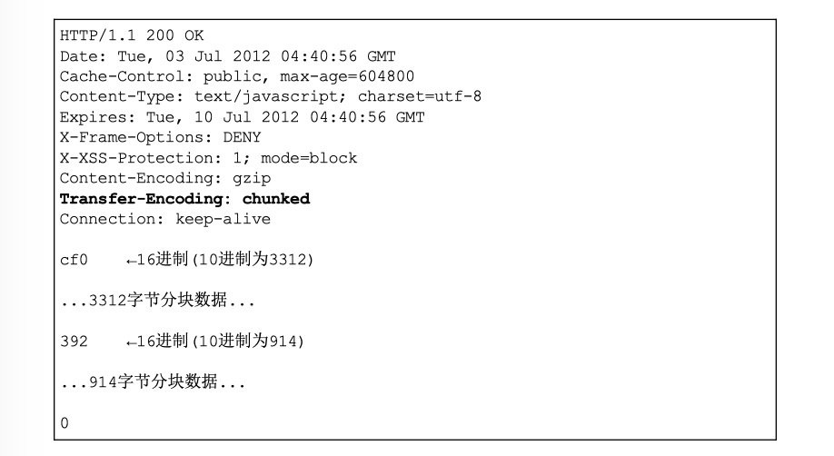 图中的用例,首部字段Transfer-Encoding中指定的那样,有效使用分块传输编码,且分别被分成3312字节和914字节大小的分块数据