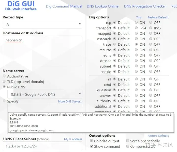 如果你使用的是linux系统,本身就自带了dig命令,如果是windows系统,使用网页版工具diggui就好了。