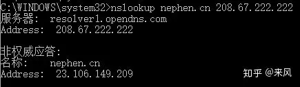 当然windows也有自带的nslookup可以查询,直接就能查出解析后的地址,其中208.67.222.222为手动选择的递归服务器,跟上面例子中的8.8.8.8是一个性质的。