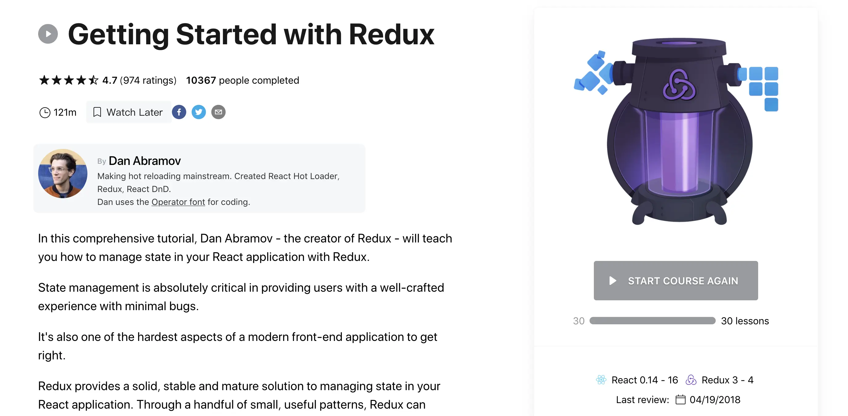 Redux 作者 Dan Abramov 亲自教 Redux 入门,及最佳实践。总时长 4 小时多,每小节不到 10 分钟。也是第一次看英文视频教程,对着英文字幕连滚带爬的跟下来了,收获非常大,每个视频下面有视频的文本,看不懂的地方看文本。跟着高手写代码真是身心舒爽~