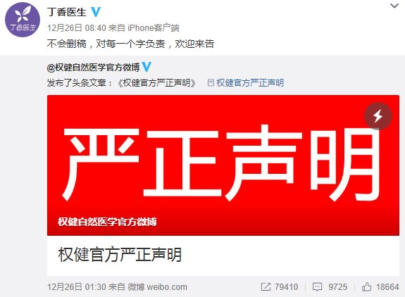 丁香医生在微博上转发表示:不会删稿,对每一个字负责,欢迎来告。