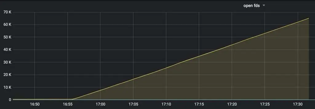 配置的最大打开文件数只有 65535,使用 lsof -n | grep dsp |grep TCP | wc -l 发现数据和之前接近,只小了几个,那是日志文件占用的。