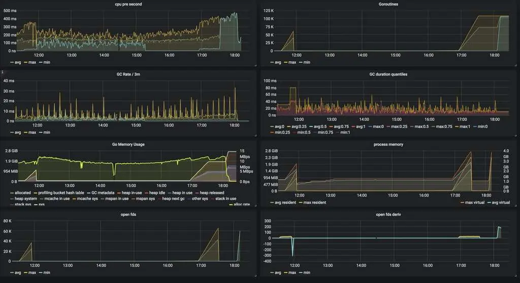然后我再往下看(实际页面是在需要滚动屏幕,第一屏只显示了上面6个模块),发现 open files 和 goroutine 的情况一致,并且之后的数据突然中断,